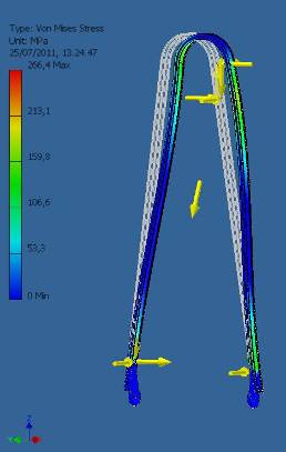 Fig.1. Sforzo di von Mises sull’arco. Si raggiunge un massimo di 266,4 MPa. |