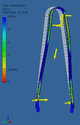 Per quanto riguarda l’arco, si può vedere dalle immagini (Fig. 1,2,3) come sia in grado di sostenere gli sforzi ad esso applicati. L’unico aspetto critico è lo spostamento che tocca un massimo di circa 6 cm. Questo spostamento si può comunque ritenere accettabile perché viene raggiunto solo nella situazione di massima sollecitazione dell’arco e quindi per la maggior parte del tempo non si arriverà a valori così elevati dello spostamento. Inoltre considerate le grandi dimensioni dell’arco, che sono di 5m di altezza per 2m di larghezza, si possono ritenere ragionevolmente trascurabili i 6 cm dello spostamento massimo. |
