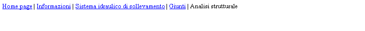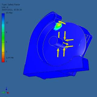 Tutte le forze agenti sull’arco vanno a scaricarsi sull’albero del giunto che però come si può vedere dalle immagine (Fig. 4,5,6) riesce a reggere tale sollecitazione. Solo la forza che i pistoni esercitano in direzione perpendicolare all’arco si va a scaricare sul blocco nella parte superiore del giunto. L’alto valore dello sforzo massimo è dovuto all’intaglio, ma bisogna tenere conto che ci troviamo nella situazione più critica e che comunque il fattore di sicurezza è superiore a 1. |