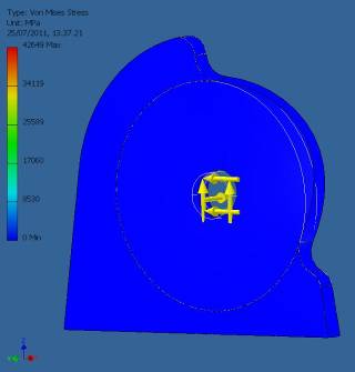 Fig.7. Sforzo di von Mises sulla piastra. Si raggiunge un massimo di 42649 MPa. |