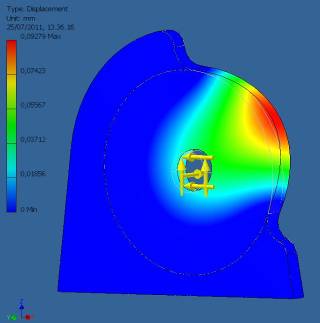 Si nota che il fattore di sicurezza è molto basso quindi non sarebbe accettabile. Comunque si è deciso di considerarlo accettabile in quanto per realizzare l’analisi strutturale si è aumentato di mezzo millimetro lo spessore della parte di piastra racchiusa nella circonferenza visibile in Fig. 8. Questo procedimento è necessario per l’applicazione della forza che agisce in direzione perpendicolare alla piastra. Questo ,se pur piccolo, aumento di spessore dà origine ad una concentrazione degli sforzi in prossimità dell’intaglio che si viene a formare. Come si può vedere dalla figura 8 infatti la zona dove il coefficiente di sicurezza è minore di 1 si trova esattamente sull’intaglio appena citato. Per questo motivo si è ritenuto verosimile che nel caso in cui la piastra fosse piana, come effettivamente si presenta nella realtà, non ci sarebbe una concentrazione di sforzi così alta lungo la circonferenza e probabilmente il fattore di sicurezza sarebbe accettabile. Per lo stesso motivo si ha uno sforzo di von Mises eccessivo però molto concentrato lungo la circonferenza tanto da non essere visibile in figura 7. |