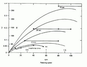 Come si vede dal grafico a fianco, la potenza erogata tramite la pedalata decresce nel tempo. Si può notare come un professionista molto allenato sia in grado di produrre una potenza di 200W per varie ore, potenza che si dimezza a 100W per una persona comune.