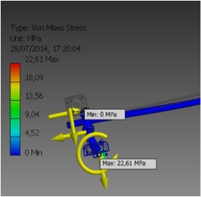 Il risultato, caratterizzato dall’assenza di singolarità locali di sforzo, evidenzia uno sforzo massimo di 23 Mpa situato sulla piastra inferiore con un coefficiente di sicurezza pari a 9.