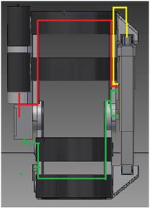 La linea gialla raffigura il collegamento tra l’inverter e l’attuatore. In questo caso è importante notare come il collegamento alla corrente della batteria passi prima per l’inverter che, secondo comando della scheda madre, agirà per dare la direzione corretta al flusso di corrente e di conseguenza all’azione dell’attuatore .
