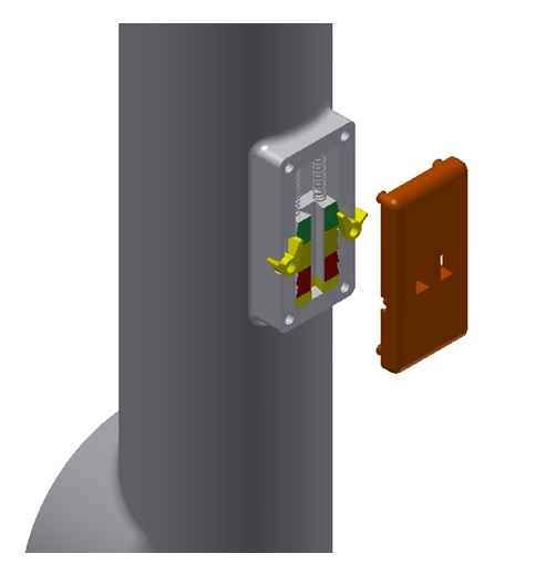 La linguetta ad incastro (rappresentata in giallo, solidale alla parte interna) forza lo scorrimento del visualizzatore verso l'alto.