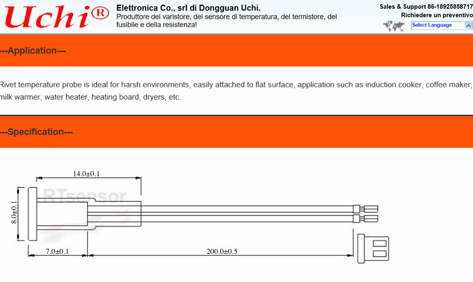 Il sensore montato ha le seguenti caratteristiche dimensionali illustrate in figura. Inoltre ha una tolleranza di ±3°C, quindi soddisfa i requisiti, ed è pensato per applicazioni in ambito alimentare.