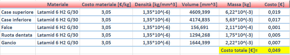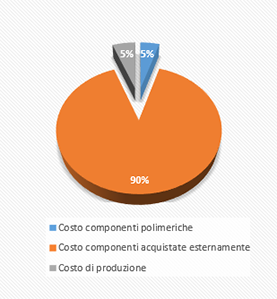 Analisi dei costi: nella ripartizione dei costi abbiamo considerato il costo dei componenti polimerici prodotti in latamid, i costi di produzione ed il valore commerciale delle componenti acquistate da terzi (molle, filo SMA, microswitch, crimpaggi, lamine e perni metallici). costi componenti polimerici: Calcolato l’ingombro volumetrico delle componenti stampate, siamo in grado di definirne un costo, partendo dalla conoscenza del costo al kg del materiale polimerico utilizzato (Latamid 6 H2 G/30), facendo fede all’ultimo aggiornamento della quotazione di tale materiale riferitoci dall’azienda fornitore Lati S.p.A. costi componenti polimerici