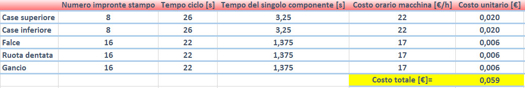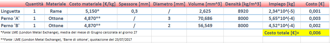 Dato che la linguetta subisce un processo di piegatura ed i perni un processo di tranciatura il costo attribuito a questi elementi viene approssimato da 0,006 € a 0.01 €