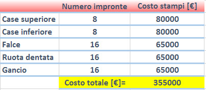 Conducendo un’analisi più dettagliata, abbiamo considerato anche i costi attribuibili all’operazione di montaggio del bloccoporta. L’operazione di assemblaggio viene eseguita manualmente. Infatti, essendo il quantitativo totale richiesto inferiore alle 500000 unità/anno (le lavabiancheria a carica dall’alto hanno una diffusione più limitata rispetto alle tradizionali a carica frontale, quindi si prevede un quantitativo richiesto inferiore per questa tipologia di bloccoporta), l’azienda ritiene ancora economicamente valido ricorrere ad operazioni di assemblaggio non automatizzate. Dati fornitici dall’azienda stimano in 0.05 € il costo di ogni singola operazione, la cui durata in media è di 6 secondi. Il nostro prodotto prevede la presenza di 8 componenti. Si ritiene ragionevole supporre 8 operazioni di assemblaggio, per un costo totale relativo all’assemblaggio pari 8*0.05=0.40 €. Ulteriori costi relativi a test e verifiche di collaudo ed imballaggio vengono stimati in 0.10 €. Analizziamo ora il costo degli stampi ( ci siamo basati su una stima riguardante la dimensione degli stampi stessi,il numero di impronte e sulla complessità tecnologica delle lavorazioni necessarie). si è deciso, in accordo con l’azienda, di considerare solo la metà del loro costo totale. Infatti molte volte sono gli stessi clienti ad acquistare e fornire gli stampi da utilizzare, quindi abbiamo ritenuto di poter attribuire solo il 50% del costo al bloccoporta. Esso sarà strettamente dipendente dalla quantità di pezzi prodotti/anno. Considerando un quantitativo pari a 500000 pezzi/anno, avremo una maggiorazione di costo per singolo pezzo pari a (355000/500000) * 0.5=0.355 €.