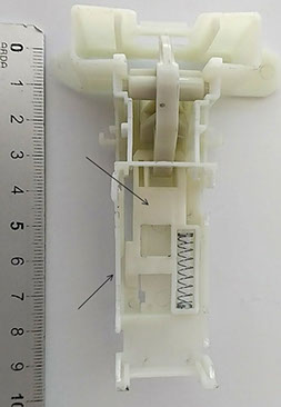 Modello in commercio: Abbiamo analizzato il modello di riferimento di bloccoporta per lavabiancheria a carica dall’alto attualmente prodotto dalla Rold. Come si vede dalla seguente foto, il meccanismo di funzionamento prevede la presenza di una guida ricavata all’interno del case su cui scorre una slitta, azionata dalla chiusura della porta stessa dell’elettrodomestico. Una volta raggiunta la configurazione di chiusura, la parte di attuazione si occuperà di bloccare il meccanismo, impedendo l’apertura della porta, e questo viene fatto tramite un piccolo gancio che blocca la slitta in quella posizione.