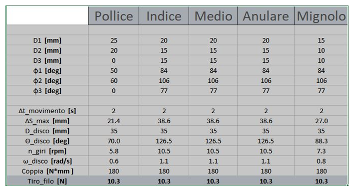 Usando questa modellazione per ogni singolo dito, è possibile valutare la velocità di rotazione richiesta dal dispositivo e il relativo numero di giri.