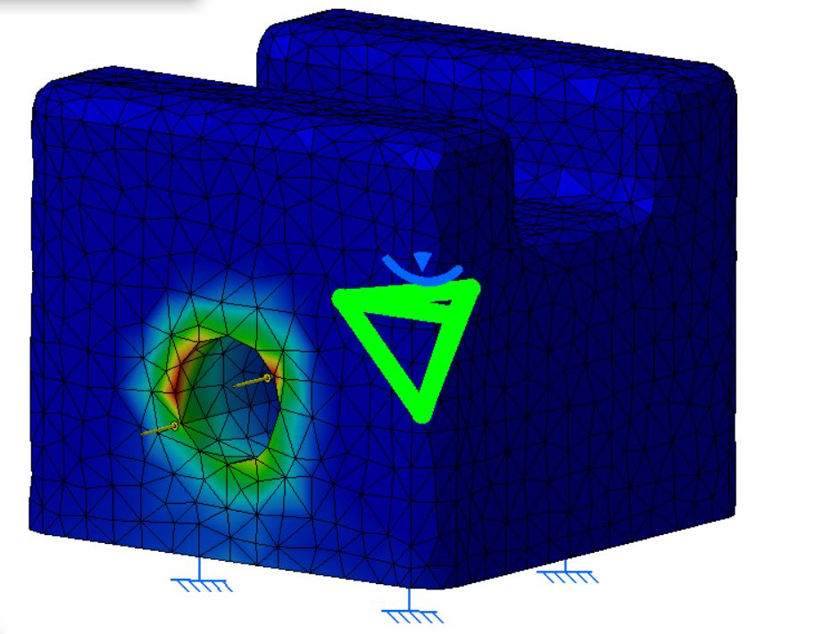 La forza agente sul ditale, pari a 10 N, viene considerata come applicata solo sul bordo del foro. Questa forza è dovuta al nodo terminale del cavo in nylon che è in battuta contro il componente in PLA, permettendo la chiusura e l'apertura del dito. La base si considera incastrata al fine di simulare l'incollaggio al guanto.