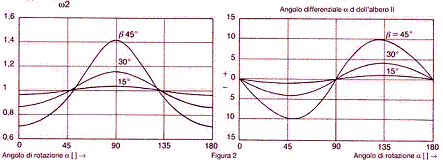 Il singolo giunto, in dipendenza dell'angolo di inclinazione ß, trasforma il movimento rotativo uniforme dell'albero I in un movimento non uniforme dell'albero II. Ciò ha conseguenze sull'impiego e la vita del componente. (fig 3,1 giunto cardanico semplice) Si ha quindi un'irregolarità del moto, evidenziata dal'andamento della velocità ω 2 dell'albero condotto e dell'angolo differenziale tra i due alberi: ![]() (fig. 3,2) La velocità angolare può essere ricavata dalla seguente equazione che esprime il rapporto tra le velocità angolari del primo e del secondo albero. ![]() Il grado di irregolarità U dell'articolazione cardanica si esprime come ![]() Appare chiaro che l'irregolarità risulta maggiore con l'aumentare dell'angolo di inclinazione β. Per compensare tale irregolarità è quindi necessario introdurre una seconda articolazione che elimini tale fenomeno. Si parla di “doppi giunti cardanici”, che sono i giunti presi in considerazione in questo progetto. L'impostazione a due giunti consecutivi permette di raggiungere la regolarità del moto dell'albero condotto a condizione di rispettare i due seguenti vincoli: