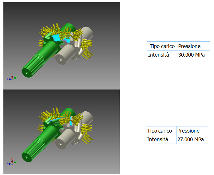 | Grazie ad Autodesk Inventor è stato possibile simulare il gradiente di pressione durante il passaggio all’interno della pompa. Si sono utilizzate le condizioni di lavoro peggiori, cioè al massimo della pressione a catalogo. Di seguito le immagini relative al gradiente di pressione applicato sui rotori: |
